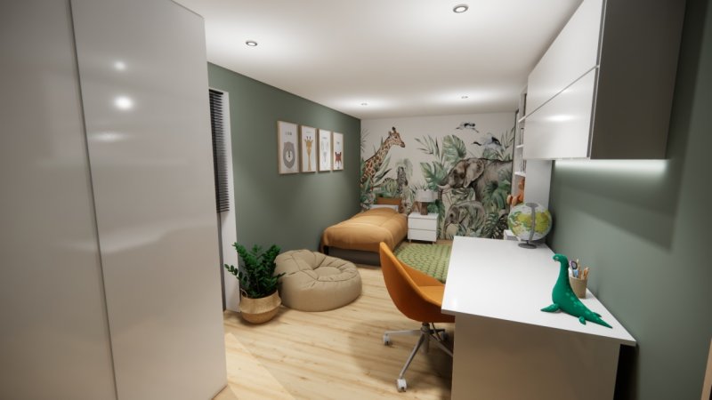 V horním patře je k dispozici ložnice s vlastní šatnou, 2 pokoje, WC spojené s koupelnou a chodba.