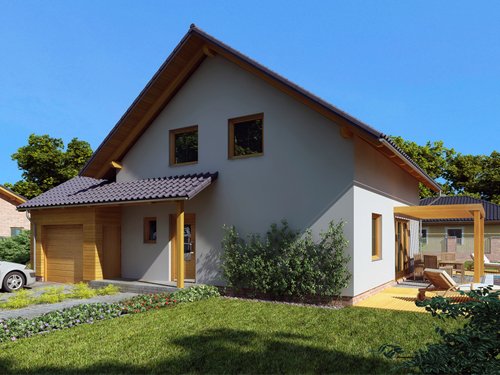 Větší dřevostavba na klíč vhodná i pro užší parcely, je možno i jako dvojdům. Velmi je ceněno jeho praktické řešení a variabilita interiéru.