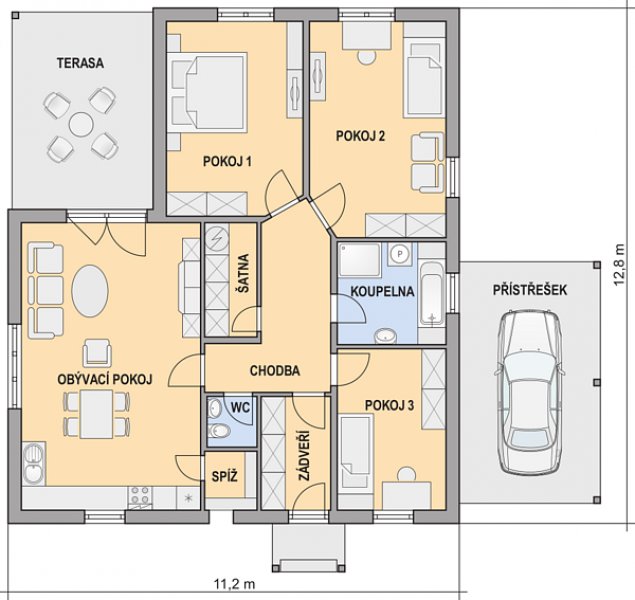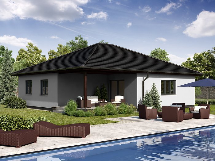 PETRA je dům větší velikostní kategorie s garážovým stáním a krytou terasou. Je vhodný do jednopodlažní zástavby. Uspokojí 3 – 4 členné rodiny. Třetí pokoj lze využít jako dětský pokoj, pracovnu nebo jako pokoj pro hosty.