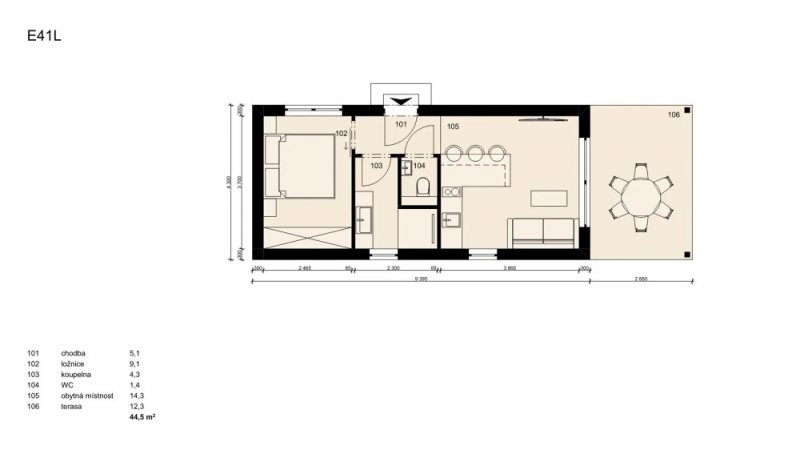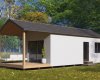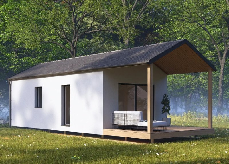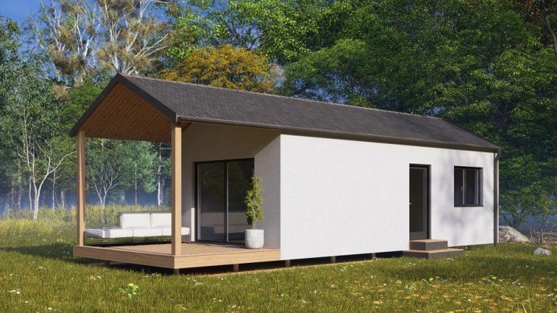 Hledáte dům, který můžete mít téměř okamžitě? Tento převozový dům je již ve fázi hrubé stavby a bude kompletně vybavený a připravený k převezení na váš pozemek do 2-3 měsíců. Naše firma je schopna pomoci s projektem a vyřízením stavebního povolení. (cena na vyžádání u obchodního zástupce). Dům má dispozici 2+kk (užitná plocha domu je 34 m2 a terasa 12,3m2), což je ideální velikost pro menší rodinný dům, nebo rekreační objekt. Dům bude postaven na zemních vrutech, které zajišťují stabilní a spolehlivý základ. Vytápění je řešeno elektrickým podlahovým topením. Okna jsou kvalitní trojskla v antracitové barvě, přičemž v obývacím pokoji s kuchyní najdete velké balkonové dveře, které zajišťují dostatek denního světla a krásný výhled na terasu. Koupelna je kompletně zařízená a součástí domu je i vinylová podlaha, stylové interiérové dveře a bojler na ohřev vody. Na výběru interiéru ( podlahy, sanita, dveře a vzoru obkladů a dlažeb) se lze podílet u našeho dodavatele ( SIKO/Keramika Soukup). Vnější vzhled domu tvoří bílá fasáda a plechová střešní krytina s imitací tašek od rmy Satjam v antracitové barvě. Moderním prvkem je protažené zastřešení, kde vznikne prostorná terasa pro posezení v rámci domu. Plné vchodové dveře v barvě antracit jsou rovněž zahrnuty v ceně. K domu je možné přiobjednat také saunu, která vám poskytne dokonalou relaxaci.. Prohlídka domu je možná ihned, tak neváhejte a přijďte se přesvědčit, že bydlení může být jednoduché a rychlé.