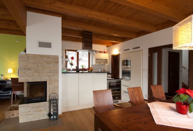 Interiér dřevostavby tvoří prostorná obývací místnost s centrálně umístěným krbem, volně navazující na prostor jídelny a velkoryse řešené kuchyně. Dále v přízemí oceníte ložnici, pracovnu, spíž, technickou místnost, koupelnu se sprchou a samostanou toaletu. Díky zajímavému dispozičnímu řešení najdete v přízemí plně vybavený 3+kk. Patro dřevostavby pak nabízí dětěm prostor pro hry i soukromí – 2 dětské pokoje (možno řešit i jako 1 velký spojený prostor) a koupelna s vanou. Prostorná terasa, která je přístupná z obýváku, ložnice i koupelny a je zčásti zastřešená výraznými přesahy střechy, zvětšuje v letních měsících obytnou zónu směrem do zahrady.