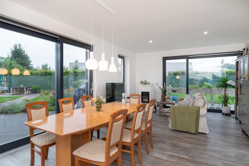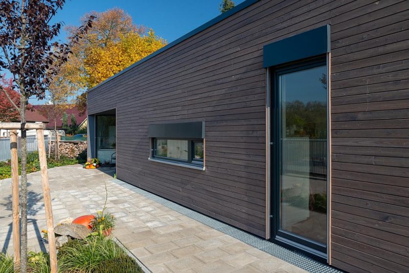 Dům na zakázku je zajímavý svým půdorysem, vhodně navrženým na daný pozemek. Dispozice je uživatelsky příjemně vytvořená a celkově působí interiér prosvětleně. Projekt zpracovával návrh rodinného domu, který slouží jako bezbariérový. Fasáda je kombinací obkladu modřínovými olejovanými palubkami a cementovláknitých desek.