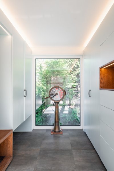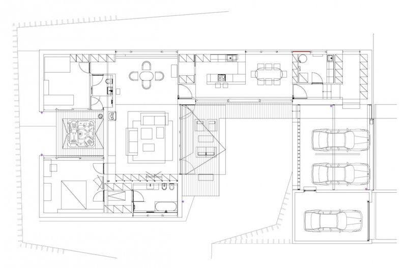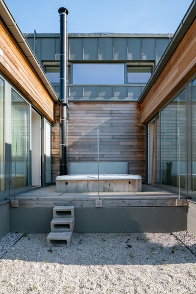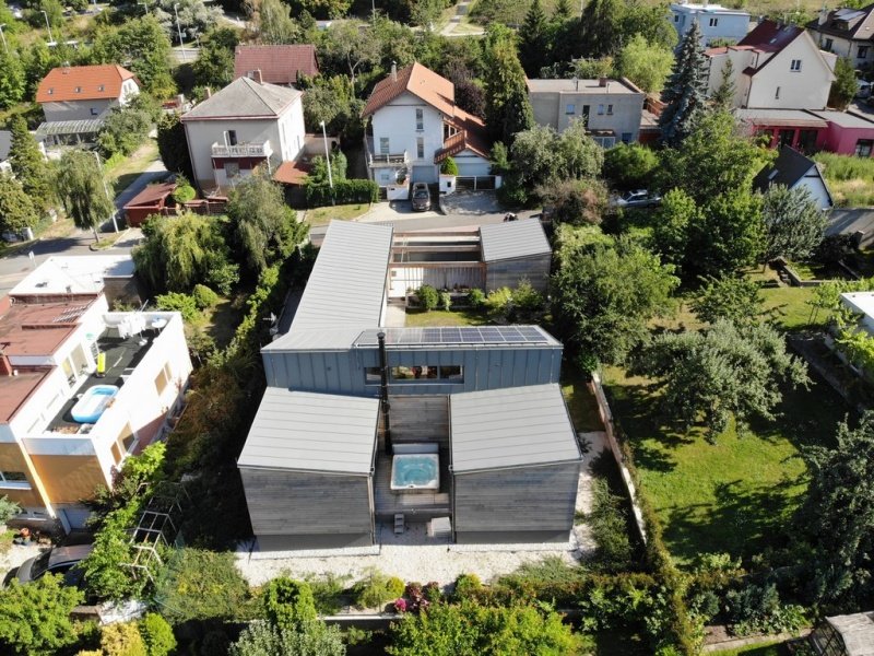 Novostavba rodinného domu je výrazně ovlivněna menším pozemkem, orientací sousedních rodinných domů a terénem. K dosažení pohodlného a intimního života klientů je dům navržen s větším a menším átriem, do kterých jsou orientovány prosklené stěny obytných místností. Pobytová zahrada domu je vytvořena v jeho středu. Na ni navazují hlavní obytné prostory, obývací pokoj a jídelna.