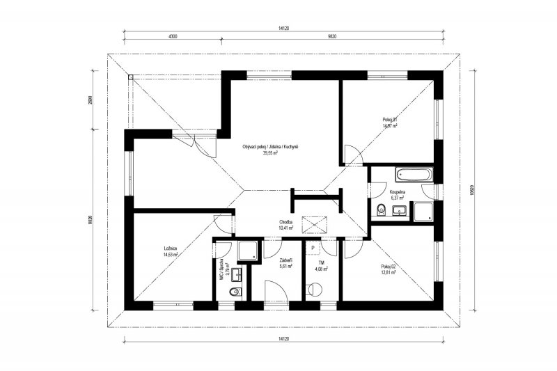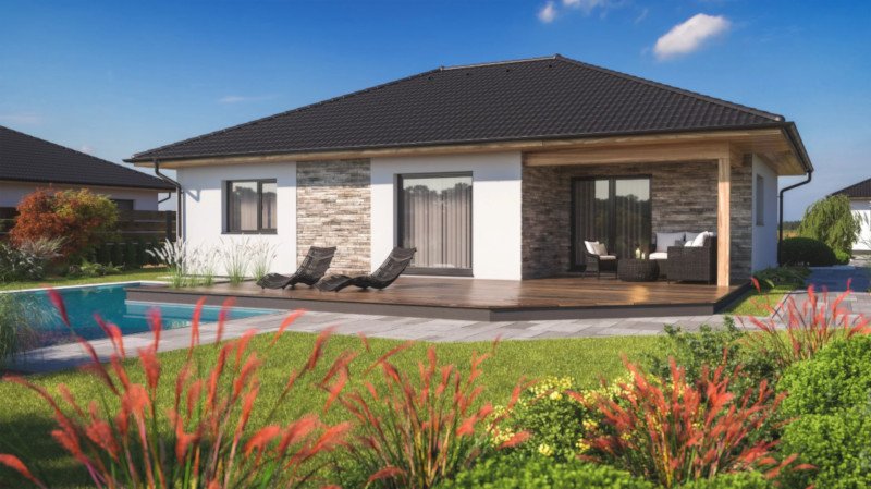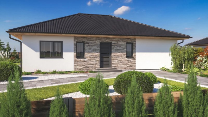 Promyšlené dispoziční řešení 4 + KK bungalovu Rio 3-112 nabízí na užitné ploče přes 112 m2 originální umístění tří ložnic do jednotlivých rohů domu. Centrum bungalovu tvoří velký obývací pokoj s kuchyňským koutem.