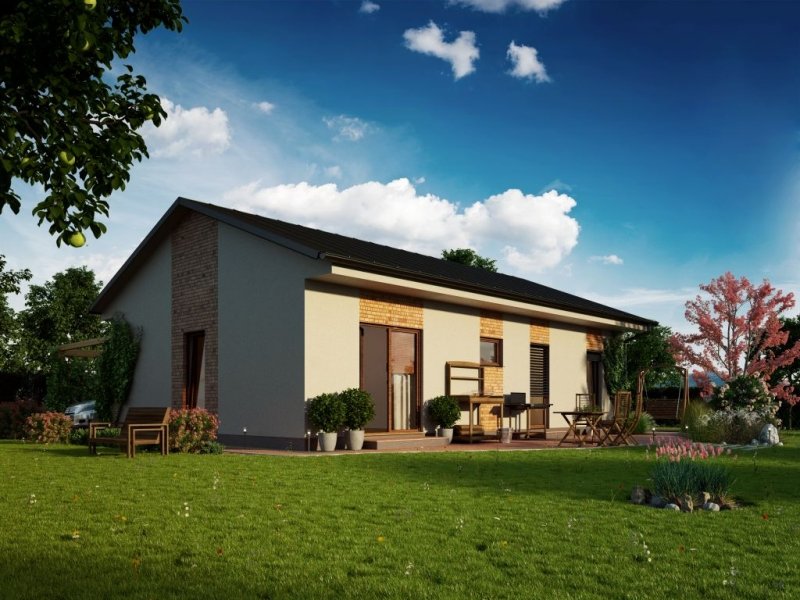 Omrzelo vás již bydlení v panelákovém bytě 2+1 na sídlišti a toužíte po životě v rodinném domečku se zahradou? Pak je náš bungalov MG 101 tím pravým řešením. Je jako stvořený pro mladé rodiny. Dispoziční řešení 3 + kk, kde ústřední místností domu je obývací pokoj spojený s kuchyňským koutem a jídelnou, přináší dostatečný prostor pro příjemné bydlení. Prostorné zádveří nabízí prostor pro umístění botníku i šatní skříně. Centrální prostor domu tvoří malá chodba, z které se dostaneme do ložnice i dětského pokoje. Velmi komfortně je řešeno sociální zázemí „stojedničky", kde je samostatná místnost WC s toaletou a umývátkem a také koupelny – tady je dostatek prostoru pro umístění jak pračky se sušičkou, tak i kotle s ohřívačem vody.
