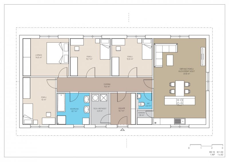 Proč se rodinný dům „105" stal jedním z našich nejprodávanějších? Kombinace kvality našich dřevostaveb, technologie difuzně otevřených konstrukcí a energetická úspornost jsou jen prvotními předpoklady. Dalšími jsou prakticky navržená dispozice domu při respektování moderních trendů bydlení. Dům je ideálním řešením pro rodiny s více dětmi nebo pokud potřebujete samostatnou pracovnu či hostinský pokoj. To vše vám náš bungalov nabízí. Je zde oddělena klidová část domu s ložnicí a pokoji od části s technickým a sociálním zázemím, kterému dominuje prostorná koupelna, technická místnost a samostatné WC. Do domu se vchází přes zádveří, v kterém pohodlně umístíte botník i skříň na svršky oděvu. A velmi podstatnou částí domu, kde se potkává celá rodina, je prostorný obývací pokoj s jídelním a kuchyňským koutem, který je doplněn místností spíže.