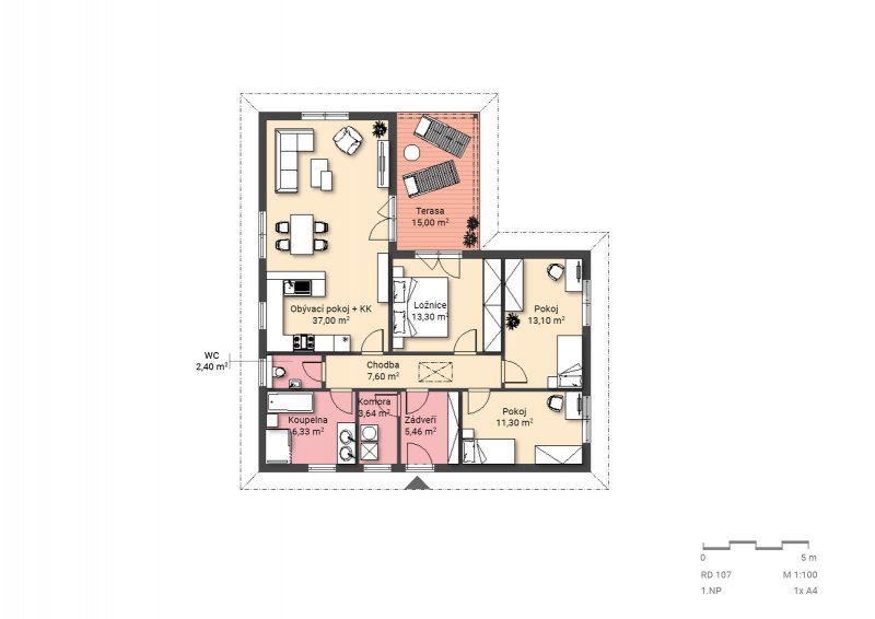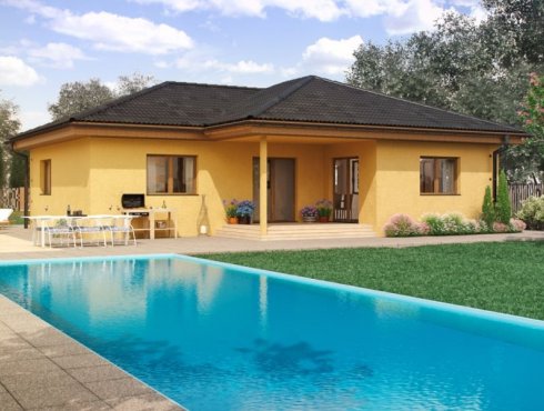 Máte dostatečně velký pozemek a chcete pěkný přízemní dům? Náš eLkový bungalov „107" je vhodným řešením přesně pro vás. Dominantním prvkem je velká krytá terasa v přesahu střechy, kterou oceníte při vašich „grilovačkách" nebo jen při posezení s rodinou a přáteli. Terasa je přístupná přímo z obývacího pokoje, který tvoří jádro celého domu, v němž se schází celá rodina. Kuchyňský kout s jídelním stolem přímo zvou ke společnému stolování. Ložnice a dva pokoje zajišťují dostatek prostoru pro vás i vaše děti. Komunikačním prostorem je chodba, z které se po stahovacích schůdcích dostanete do podstřešního prostoru. A také do jednotlivých místností. A to včetně samostatného WC a velké koupelny. V dispozici najdeme i prostorné zádveří a technickou místnost. Prostě vše, co pro pohodlné bydlení potřebujete. A samozřejmě přidanou hodnotou domu je jeho vzhled. To je dáno tím, že je dům postaven do písmene L, a navíc je terasa umístěná v přesahu střechy.