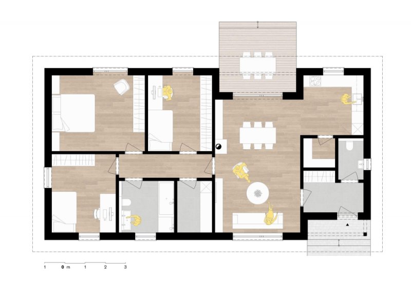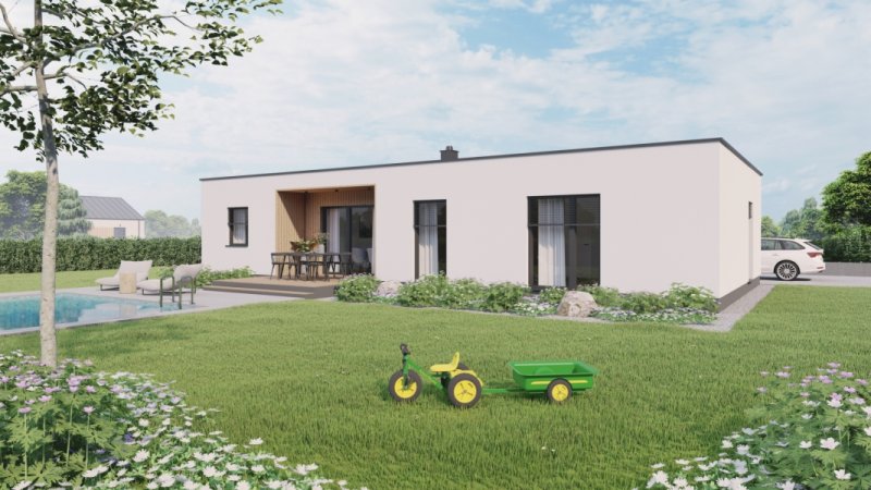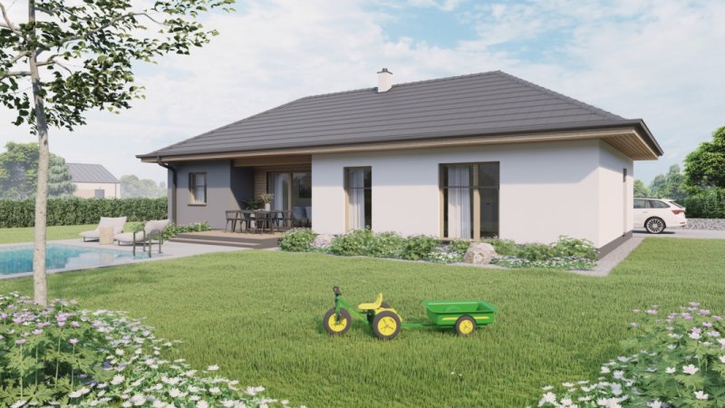 Jedná se o přízemní dům s dispozicí 4+kk. Dispoziční řešení domu s umístěním hlavní obytné místnosti ve střední části umožňuje oddělení veřejné části domu s hlavní obytnou místností od čistě soukromé části s ložnicemi. Součástí návrhu je i venkovní krytá terasa přístupná z hlavní obytné místnosti.