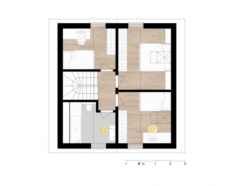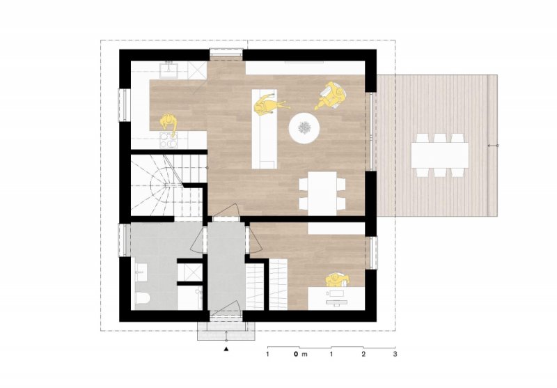 Jedná se o jednoduchý patrový dům, který i s malou zastavěnou plochu dokáže poskytnout dostatek prostoru pro komfortní bydlení velkých rodin. V přízemí se nachází zádveří, pracovna, koupelna a hlavní obytná místnost se schodištěm, na kterou navazuje venkovní terasa. V podkroví je ložnice, 2 pokoje a koupelna.