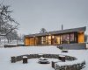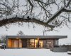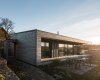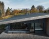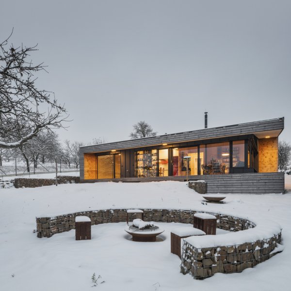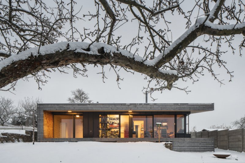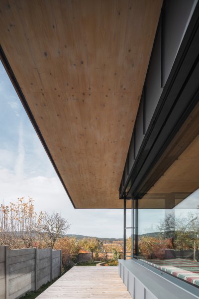 I když stavba na první pohled působí extravagantním dojmem, z okolní krajiny nikterak nevystupuje a je do ní citlivě začleněna. Dům je sice jednopodlažní, ale díky mírně svažitému pozemku si dopřává krásného výhledu na vrch Třemošná. Směrem k výhledům je objekt plně prosklen a přes terasu propojen se zahradou. Dostatečnou intimitu pobytovému prostoru dává vzrostlá zeleň, která je neoddiskutovatelným benefitem tohoto pozemku. Dům a okolní krajina jsou ve vzájemné harmonii.