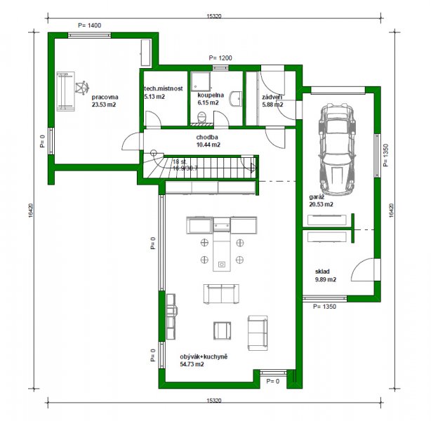 Dřevostavba řešená jako individuální realizace pro náročného klienta, jehož jasným požadavkem na dům byl velkorysý prostor pro kuchyňskou linku, který bude spojen s obývacím pokojem. Vše ostatní se proto přizpůsobilo tomuto požadavku.
