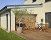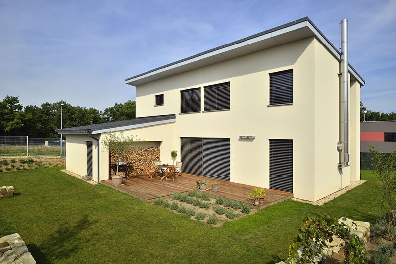 Prostor s kuchyní a jídelnou je možné snadno rozšířit o velkou terasu díky celohliníkovému vysoce kvalitnímu posuvnému oknu. Velká okna spojují exteriér s interiérem a jsou kvůli tepelným ziskům orientovány na jih. Aby byl celý prostor prosvětlený již odranních hodin, je jedno z oken umístěno i na východní stranu. Přáním klienta bylo absolutně bezúdržbové provedení exteriérů. Na podbití krovu bylo proto využito desek CEMBRIT a stejnému požadavku je přizpůsobena i zahrada.