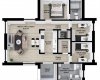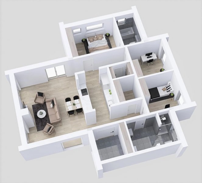 Bungalov skandinávského stylu Scandic 2-106 nabízí na užitné ploše přes 106 m2 velkorysý, světlý obývací pokoj s vestavěnou kuchyní. Navíc 3 ložnice, 2 koupelny a dostatek úložných prostor v samostatné šatně nebo spíži.
