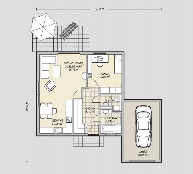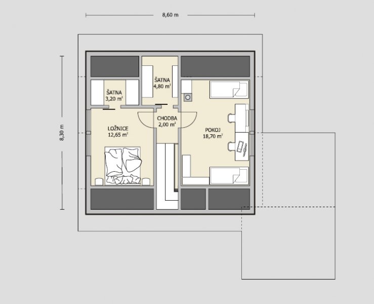 Dřevostavba na klíč s výborně vyřešeným půdorysem s dostatečně prostorným řešením 2 + 1 v přízemí. V prostoru pod schodištěm je vhodné umístit spíž nebo šatnu. V podkroví dřevostavby je možné vybudovat druhou koupelnu.