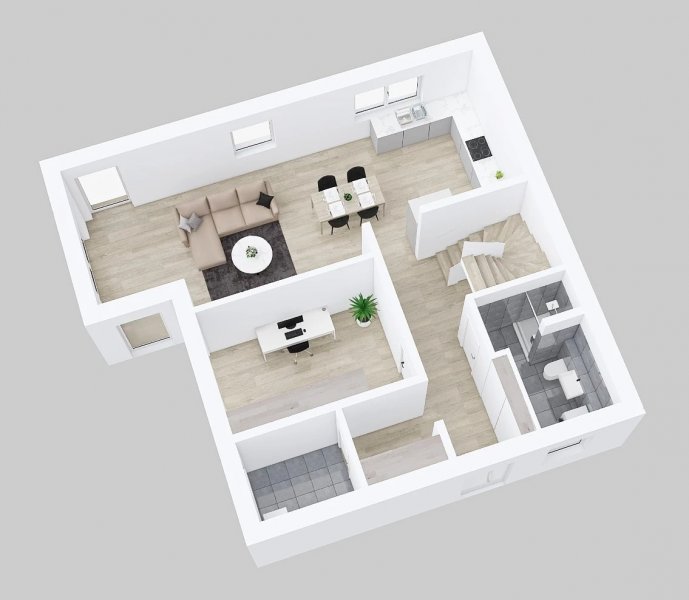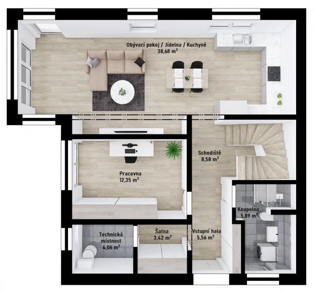 Rodinný dům Vita 2-145 je zástupcem rodiny městských vil. V půdorysu přízemí se nachází veliký obývací pokoj s kuchyňským koutem a jídelnou, pracovna, šatna, koupelna a technická místnost. V patře pak tři ložnice, šatna, koupelna a samostatné WC. Z jedné ložnice je navíc vstup na terasu.