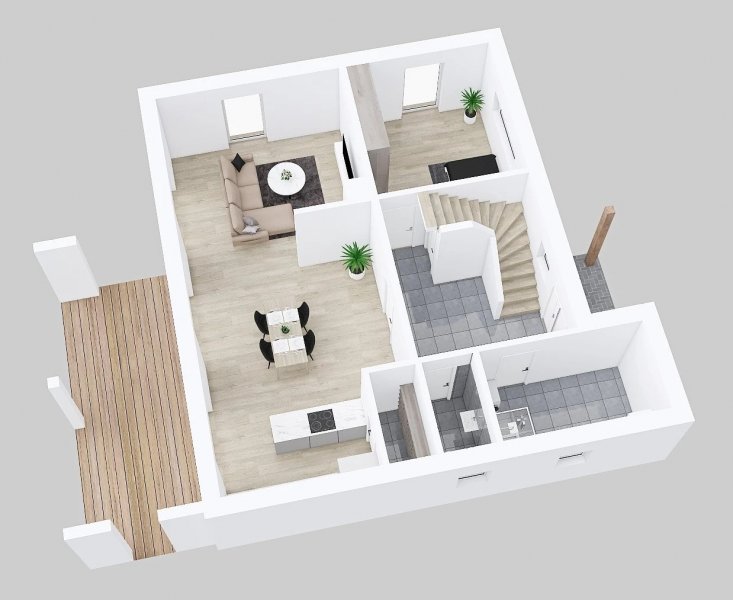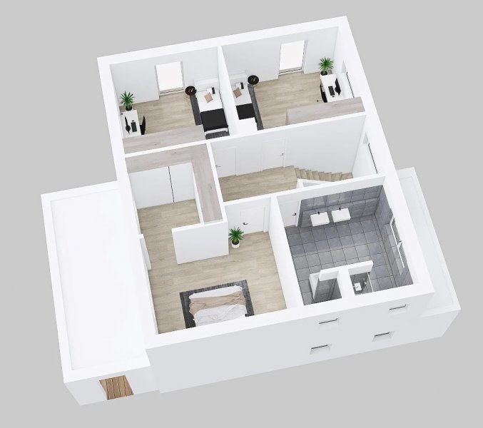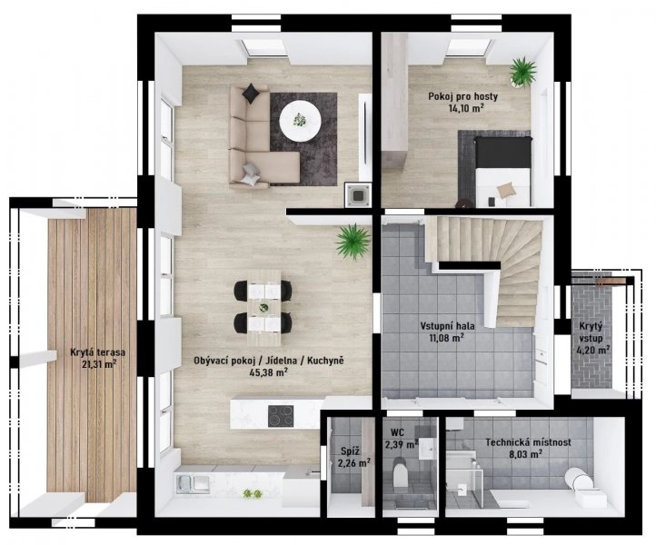Dřevostavba Vita 4-165 je opravdu prostornou vilou pro velkou rodinu. Dům vhodný především do městské zástavby nabízí na užitné ploše téměř 165 m2 veliký obývací pokoj s kuchyňským koutem propojený s venkovní krytou terasou. K tomu další 4 pokoje, obrovskou koupelnu, šatnu, technickou místnost či samostatné WC.