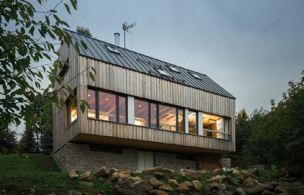 Do hor jsme sice vyrazili koncem září, kdy sychravé počasí bylo na denním pořádku, přesto nás místní podnebí překvapilo svou nehostinností. Když se ale člověk usadil na dlouhé lavici pod okny a sledoval mlhu, která se převalovala přes okolní hřeben, bylo snadné si představit, jak klidně a harmonicky se tu dají trávit dlouhé zimní večery. V objetí všudypřítomného dřeva a v kruhu milované rodiny. Na procházku domem nás tentokrát zve jeho autor, architekt Pavel Horák.