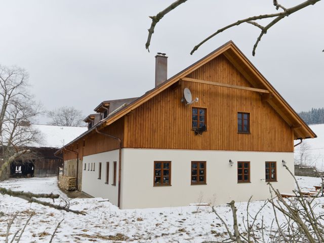 Odlehlá šumavská usedlost změnila tvář: zatímco původní stáje obývá skotský náhorní skot, obytná část je zbrusu nová – a jak jinak než dřevěná.