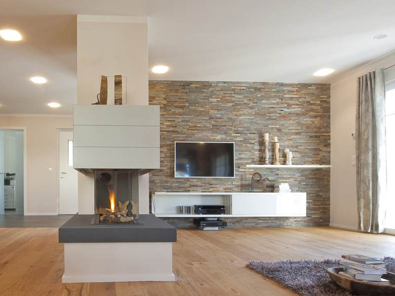 Jídelní kout s obývacím pokojem tvoří otevřený celek s přímým vstupem na velkou terasu.Projekt Lucky najdete v nabídce společnosti Haas Fertigbau Chanovice.