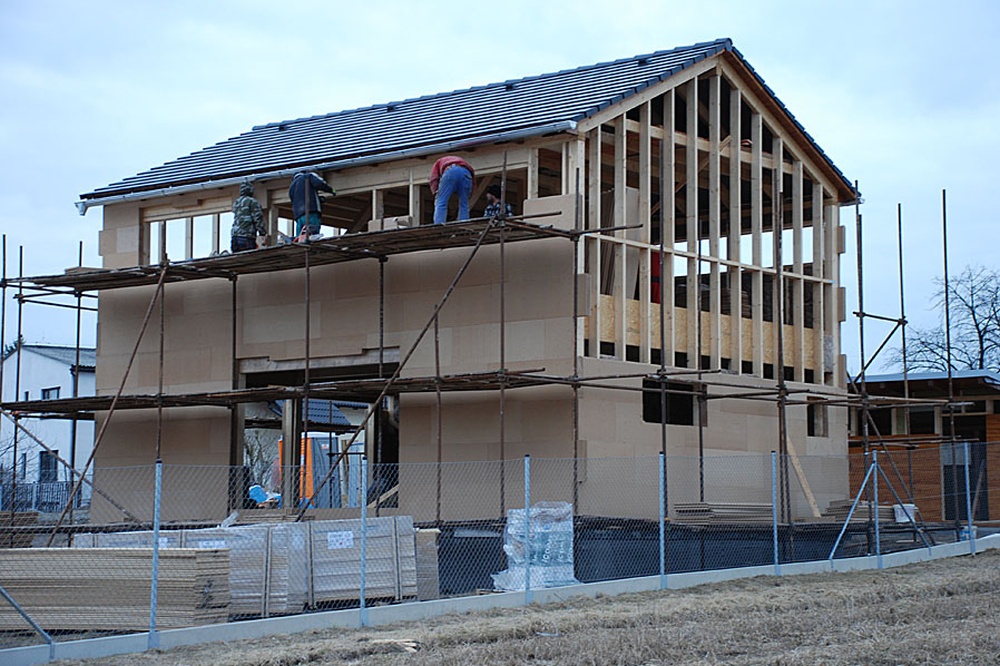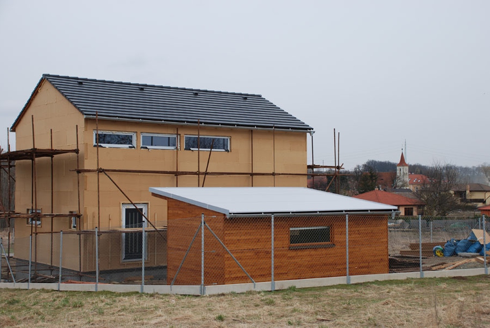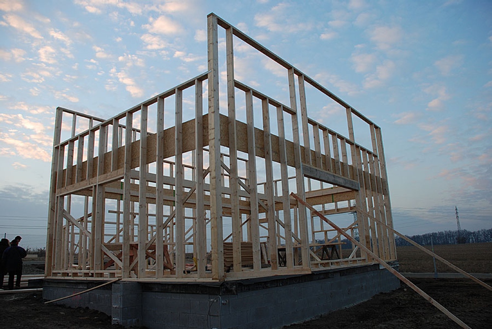 Prvním krokem realizace rodinného domu je výstavba základové desky. Protože investor požadoval dům v nízkoenergetickém standardu, je zvolena konstrukční metoda s izolovanou soklovou částí. Prvky lehkého dřevěného skeletu byly nejprve obráběny na tesárně, kde se připravily všechny spoje, následná montáž přímo na staveništi trvá zhruba tři až čtyři dny. Na dřevěný skelet je použito KVH řezivo základní dimenze 60 x 160 mm. Pro průvlaky, překlady a stropy pak dimenze silnější. Za povšimnutí stojí řešení stropu, který je k obvodovým konstrukcím připevněn pomocí vruty kotvených příložek...