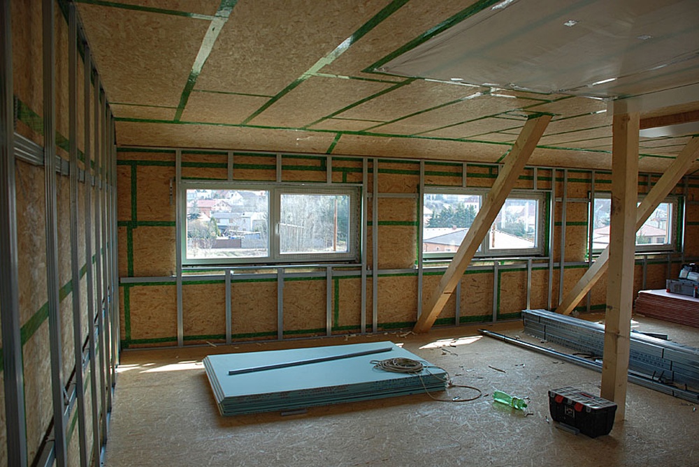 Následný technologický postup zahrnuje montáž výplní otvorů, aplikaci minerálních izolací a montáž a těsnění parobrzdné obálky z OSB desek, která plní i hlavní funkci příčného ztužení dřevěného skeletu. Následují vnitřní sádrokartonářské práce, montáž rozvodů rekuperace, elektroinstalace, vodoinstalace a dokončení domu v požadovaném rozsahu.