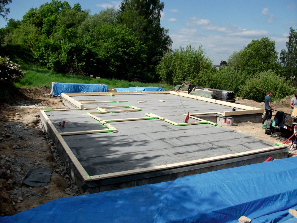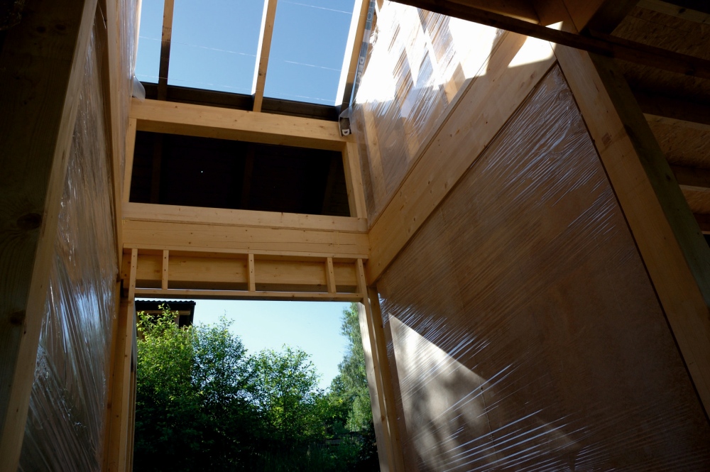 Na dokončovací práce exteriéru – bílá fasáda, navazují práce uvnitř domu. Ty postupují přes instalace, skladby podlah a předstěn až k finálním prvkům vybavení interiéru, jako jsou schodiště a koupelny. Dům je stavebními konstrukcemi koncipován jako nízkoenergetický, bez použití řízeného větrání s rekuperací. V zimních měsících plně využívá solárních zisků velkými prosklenými plochami. Primárním zdrojem podlahového vytápění a ohřevu teplé užitkové vody je tepelné čerpadlo vzduch voda, doplněné krbovou vložkou.