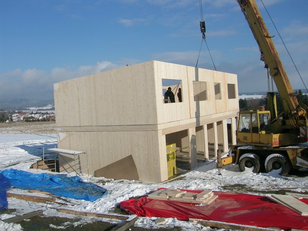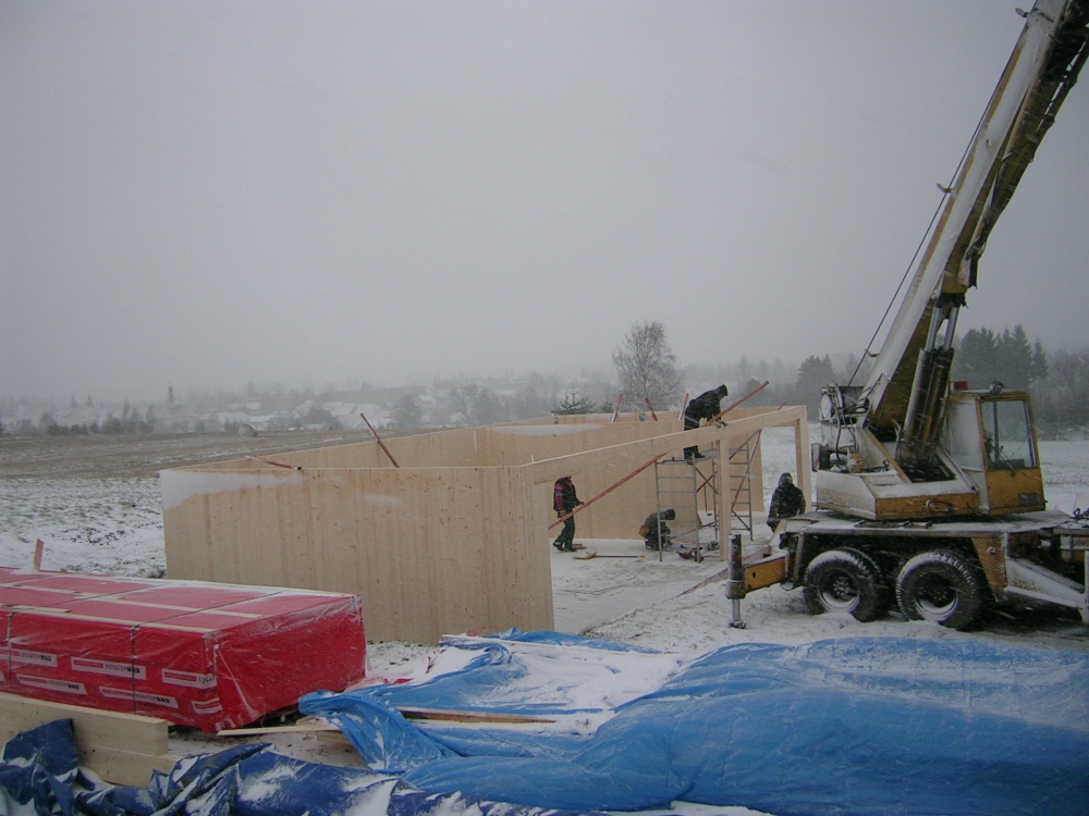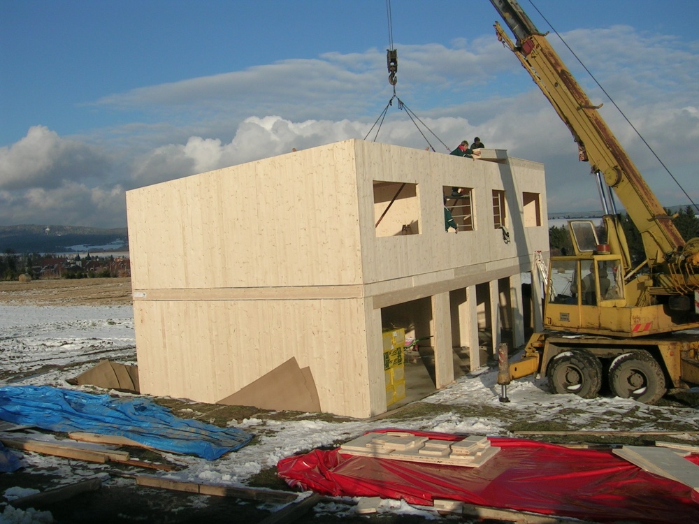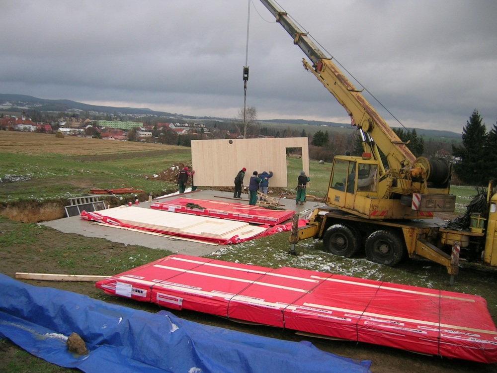 Pasivní rodinný dům je založen na pěnovém skle, což eliminuje tepelné mosty spodní stavby. Na připravenou základovou desku se vytyčí obrys nosné konstrukce a její montáž probíhá s pomocí jeřábu. Jednotlivé panely jsou očíslovány a dům se skládá skutečně jako stavebnice, na základovou desku se připevňují pomocí L profilů. Délka jednotlivých stěnových panelů je v tomto případě sedm metrů, což zásadně redukuje množství spojů, které se musí na stavbě ošetřit. Všechny panely se spojují vruty do dřeva, napojení a rohové spoje jsou prolepeny PUR lepidlem a z venkovní strany přelepeny vzduchotěsnou páskou...