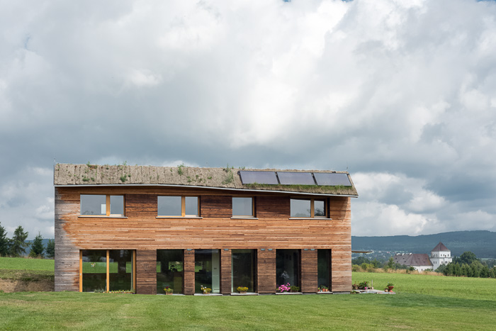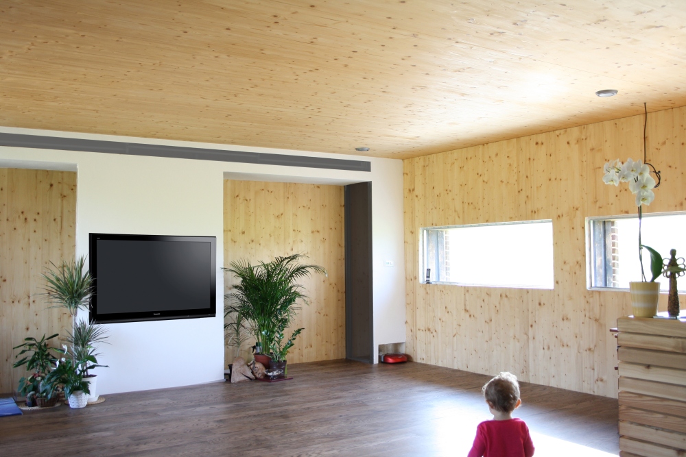V interiéru jsou panely NOVATOP ponechány v pohledové kvalitě. Přírodní dřevo je kombinováno s bílými příčkami a velkými prosklenými plochami. Panely NOVATOP jsou natolik tvarově stabilní, že je možné osadit sklo přímo do konstrukce, bez použití jakýchkoliv rámů. Práce uvnitř domu postupují standardním způsobem přes instalace, podlahy až po obklady a vybavení. Srdcem domu je akumulační nádrž, do které potřebnou energii dodává tepelné čerpadlo vzduch-voda a solární termické panely. Na nádrž je také napojena vzduchotechnická jednotka, která teplo distribuuje po celém domě. Tato jednotka slouží také k nucenému větrání s rekuperací tepla.