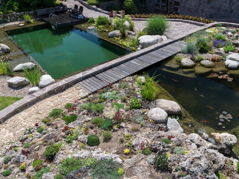 Nahlédněte s námi do zahrady, jejíž majitelé si vytvořili vodní ráj – dominantou nevelkého prostoru je koupací jezírko doplněné menší nádrží s okrasnými rybkami. Chodník vedoucí přes vodní hladinu vytváří dojem, že jsou obě jezírka propojena, opak je ale pravdou: chov ryb se s průzračnou vodou zásadně neslučuje, proto bylo třeba vytvořit dva oddělené prostory.