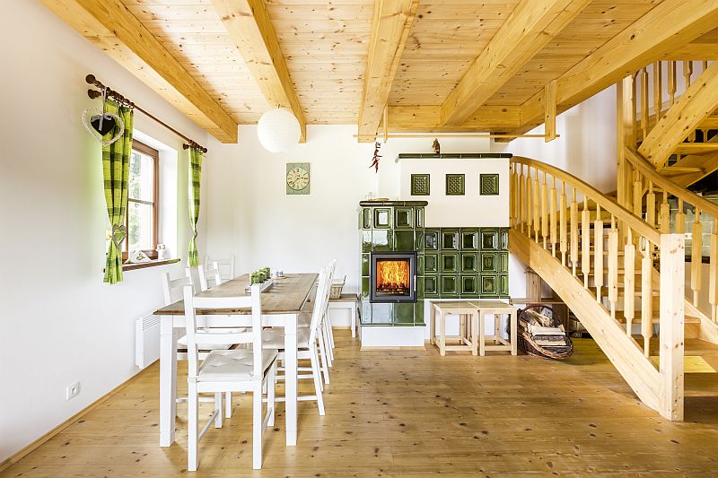 Interiér tradičního šumavského stavení je navzdory malým oknům světlý a vzdušný. Dominantou hlavního obytného prostoru je dřevěné schodiště, v jehož blízkosti měla kamna vzniknout. „Volba tedy padla na stejně vzdušná kachlová kamna," vysvětluje Luděk Hradil z firmy Hestia, která kamna postavila.