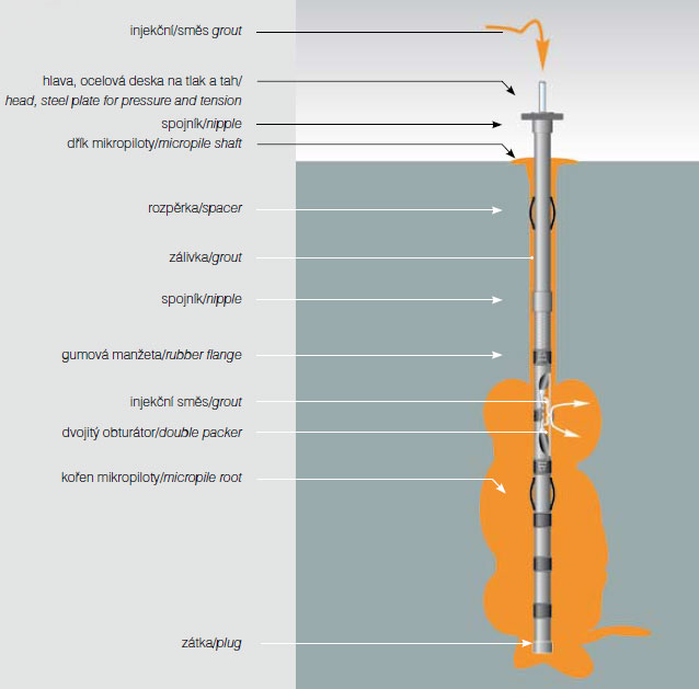Kořenová mikropilota je složena ze tří částí: hlavy, která přebírá zatížení od stavební konstrukce, dříku (trubek), který prochází obvykle neúnosnými vrstvami a kořene,