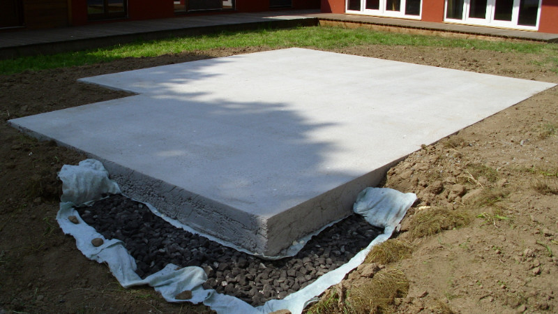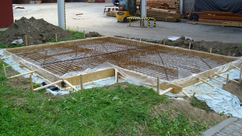 Na takto předpřipravený základ se položí šalování. Do šalování se vloží dvojité armování s krajovou vázanou výztuží a rozpěrami a rovnou se leje beton. Po odbednění této desky se ošetří boční ochranný perimetr opět pěnovým sklem. Tato deska se potom i s pěnovým sklem chová monoliticky a jakékoli pohyby (a dům se vždy pohybuje) se nepřenášejí do horní stavby.