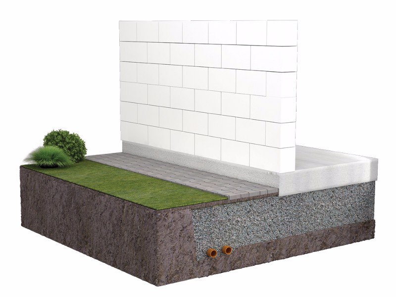 - Použití jako vodorovná tepelně izolační vrstva pod drenážní chodníček a zabezpečit tak dodatečné do-izolování základových pasů.