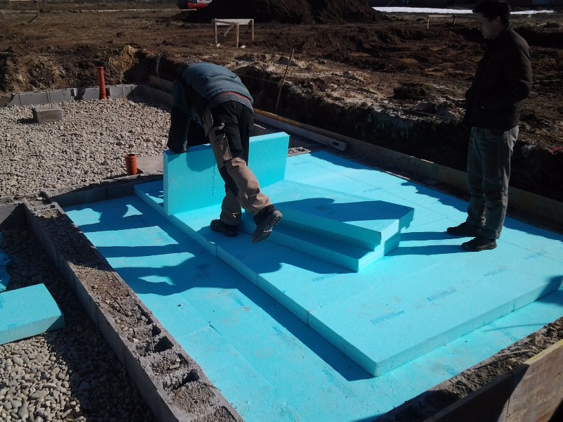 Nejběžnější je založení na betonových pasech spolu se základovou deskou, na níž je uložena tepelná izolace a vrchní stavba. Výhodou je jednoduchá realizace, nevýhodou je pak navýšení úrovně budoucí čisté podlahy vůči okolnímu terénu, a tím nevyhnutelnost schodů nebo rampy u vstupu. Často využívanou alternativní možností je uložení tvrzené tepelné izolace z extrudovaného polystyrenu pod základovou desku. Základové pasy v tomto případě je také potřeba hydroizolačně a tepelněizolačně zabezpečit. Nevýhodou je zvýšená cenová náročnost, avšak výhodou je možnost tímto způsobem zmenšit výškový rozdíl čisté podlahy vůči terénu okolní stavby.