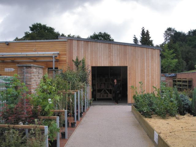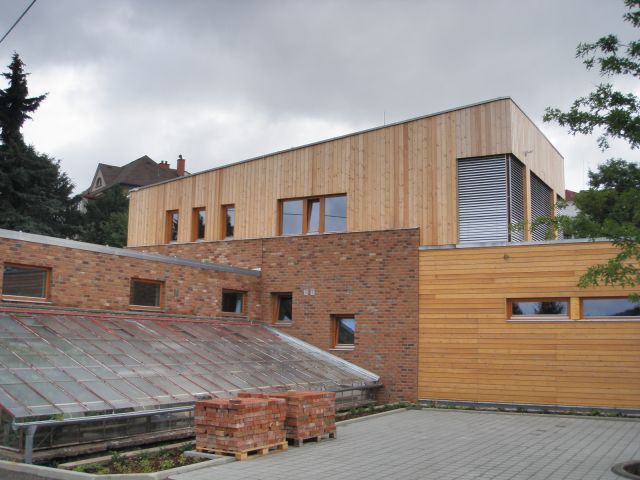 Jižním směrem od prodejny je polootevřený prodejní přístřešek, na severu dvojpodlažní část s kancelářemi a zázemím. Vzhledem k náročnosti provozu a konfiguraci terénu, do nějž je část stavby zapuštěna, bylo použito kombinace dřevostavby se zděnou technologií. Toto konstrukční členění je patrné i při zběžném pohledu z exteriéru – zděná část je zvýrazněna obezdívkou z lícového zdiva, zatímco dřevěná část je vždy obložena modřínovými fasádními palubkami. K lícovému zdivu přiléhají původní skleníky, jež budou i nadále využívány k pěstování a prodeji rostlin.