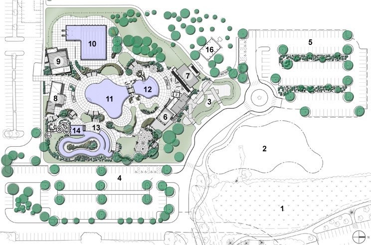Protože na lidskou psychiku působí mnohem lépe oblé, než geometricky přesné tvary, byla i forma všech chodníků a bazénů pojatá značně organicky. Kromě závodní nádrže, která musí být samozřejmě rovná, jsou tak bazény rozvlněné, což mimo jiné umožnilo i vytvoření dostatečně velkých ploch mezi jednotlivými atrakcemi. Díky tomu může zařízení pojmout mnohem více návštěvníků. Bývalý prostor akvaparku byl totiž nejen morálně i fyzicky zastaralý, město trápila především jeho nízká bezpečnost a špatná provázanost jednotlivých funkcí.
