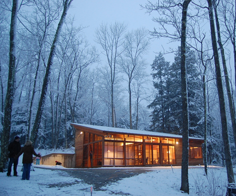 Stavba z pera architektonického ateliéru Maryann Thompson Architects leží v oblasti Berkshire County, severoamerického státu Massachusetts. Její umístění v krásné krajině bylo ale samozřejmě podmíněné mnoha pravidly, které musela stavba bezvýhradně dodržet. Především to byl požadavek na minimální možné kácení vzrostlých stromů, které nesmělo zasáhnout lokalitu většího rozměru, než ¼ akru. Stavba také nesměla svým nejvyšším bodem převýšit linii hřebenu. Její dopad na odvodnění a erozi celé lokality musí být co nejmenší, proto je zvolena střecha ve stejném sklonu jako okolní svah a terénní úpravy v těsném okolí stavby zajišťují co nejlepší vsak zachycené vody.