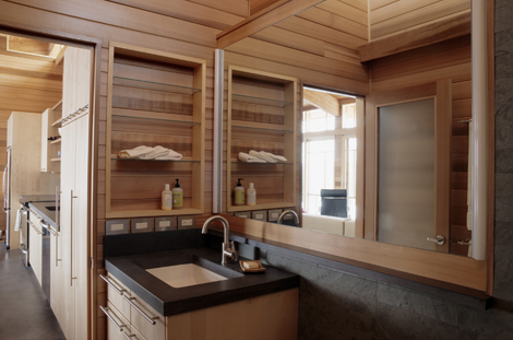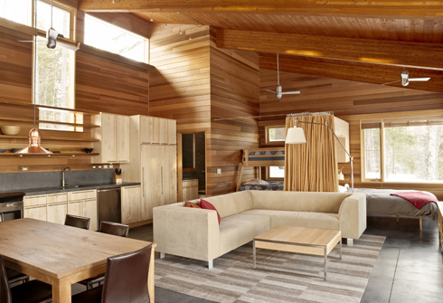 Pokud se dveře otevřou dokořán, z celého domu se stane jedna velká krytá veranda, do které pronikají tlumené sluneční paprsky a svěží a čerstvý lesní vzduch. Celá dřevostavba je postavená z červeného cedru a její konstrukce krásně ladí s okolní přírodou. Z interiéru se díky bohatému prosklení nabízí obyvatelům úchvatné průhledy do okolí, pečlivě obroubené cedrovými rámy.