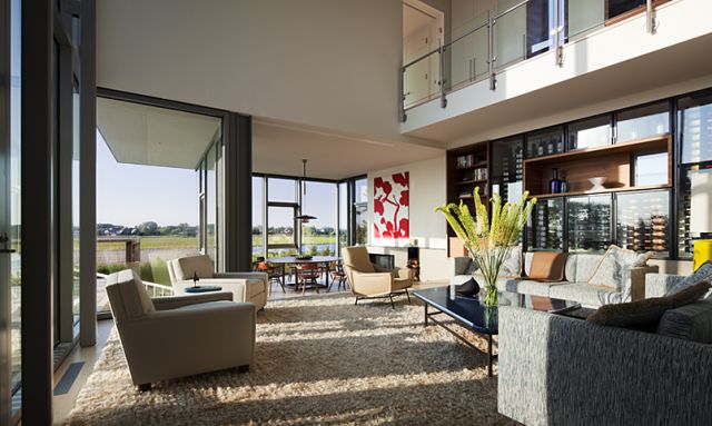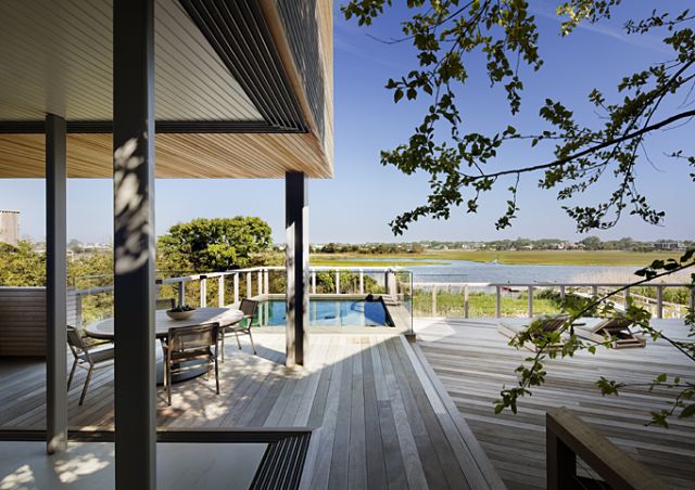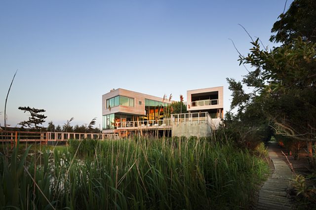 Dřevostavba usazená částí na dřevěných pilířích, částí na betonové základně, je obložená cedrovým dřevem. Dřevo se v hojné míře vyskytuje i v interiéru a samozřejmě na terase. Ta je před pohledy ze sousedství skryta v uzavřené náruči dvou částí domu, otevírá se pohledům na longislandskou úžinu a vzhledem ke své západní orientaci je skvělým místem pro pozorování západů slunce. Velkým prosklením je samozřejmě propojená s vnitřním obytným prostorem. Ten architekti řešili i z hlediska vybavení a ozvláštnili ho několika speciálními kusy vestavěného nábytku.