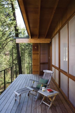 Samozřejmou a logickou volbou pro tuto lokalitu byla samozřejmě dřevostavba. A to nijak extrémně velká, jejím majitelům stačilo jen poměrně skromné vybavení – ložnice, obývací pokoj a malá kuchyně s koupelnou. Dalším požadavkem byl samozřejmě co možné největší výhled, díky kterému by se obyvatelé cítili i v interiéru jako součást okolních rozlehlých lesů.