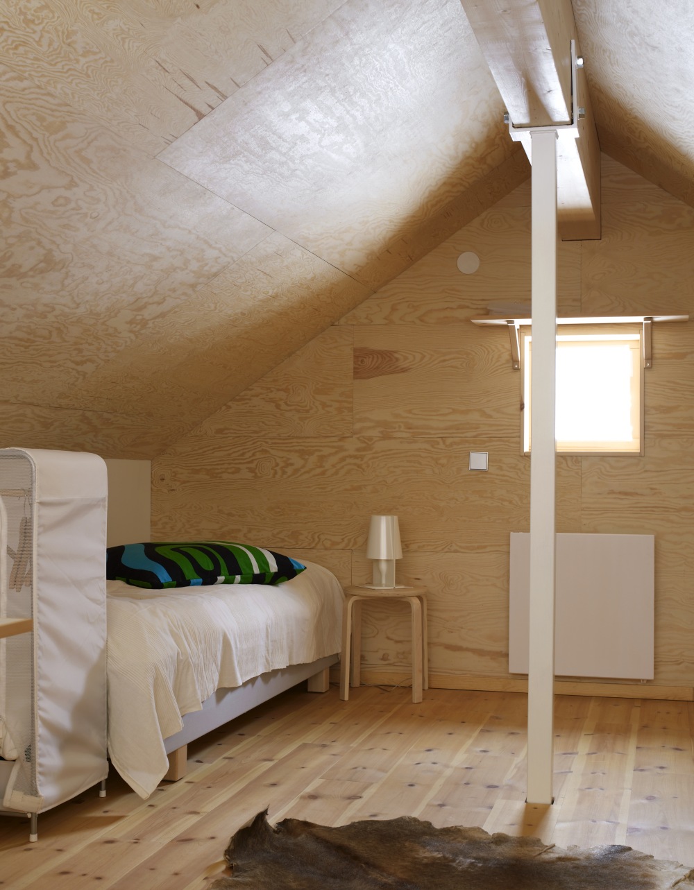 Prázdninový dům nabízí celkový komfort včetně plně vybavené kuchyně, koupelny, sauny, dvou ložnic a horního patra se třetí ložnicí. Obytný prostor je pak ještě rozšířený velkým panoramatickým oknem, který vnitřek domu propojuje s proměnlivým exteriérem. V létě tak vpouští do jednoduše a účelně zařízeného interiéru všudypřítomnou zeleň, v zimě zase klidné obrazy zasněžené krajiny.