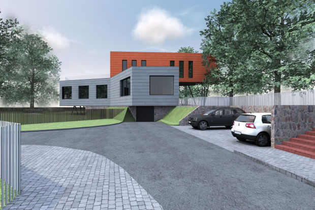 Postupně se tato pavučina rozvrstvila do dvou výškových úrovní. Nejnižší podlaží je pro optické zmenšení hmoty domu částečně ukryto v rámci terénu nabíhajícího na protipovodňovou hráz.