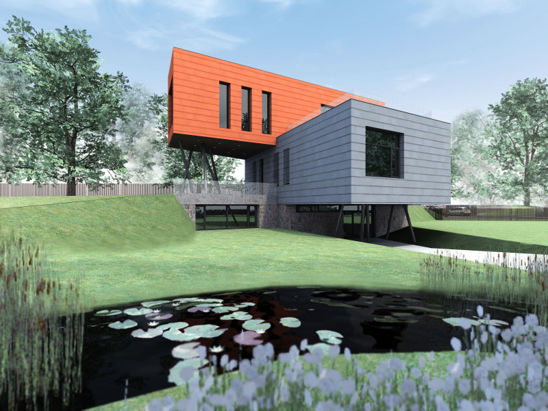 Architektonický návrh řešeného objektu novostavby environmentálního centra vytvořil architekt Tomáš Med. Inspirací při návrhu domu byly koruny okolních vzrostlých stromů s pavučinami lesknoucími se ve slunci. Vznikl tak impuls navrhnout dům jako pavučinu v korunách stromů. Není proto divu, že nadzemní část budovy je dřevěná, vyrobená z panelů Novatop.