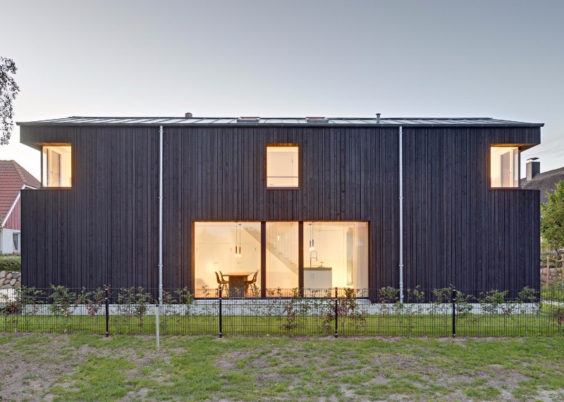 Dům stojí na úzkém pozemku ve známé rekreační oblasti na baltském pobřeží. Zaujme hlavně fasádou z černě natřených modřínových prken. Majitelé si přáli dům, který v sobě bude spojovat tradiční vzhled místních hospodářských budov s moderními prvky. Architekti zvolili jednoduchý tvar s tmavou fasádou. Ten odkazuje na místní stodoly, kterých v oblasti najedete stále ještě hodně. Moderní vzhled však domu dodávají netradiční rohová zapuštěná okna. Střecha domu je ze zinkového plechu.