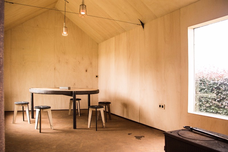 Skupina belgických designérů nábytku Stal Collectief si blízkosti místa, kde pořádají setkání a workshopy vytvořila trochu netradiční „klubovnu“ jako zázemí a místo pro společnou práci. Jedná se o malou dřevostavbu s jednou hlavní místností. Tři stěny a střecha jsou však umístěny na masivních kolejnicích, lze je odsunout a tím změnit interiér na otevřenou venkovní terasu. „Naším záměrem bylo vytvořit prostor, který lze rychle změnit z vnitřního na venkovní,“ popisuje jeden z tvůrců domku Bob Segers. Dobrý výhled z interiéru do okolního prostředí byl pro autory velmi důležitý.