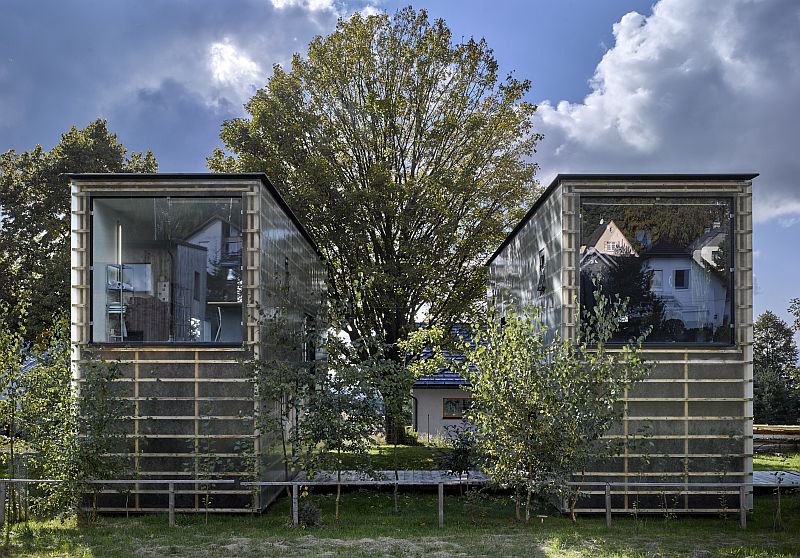 Funkce: Práce a relaxace. Dvě oddělené a přesto neoddělitelné nádoby, v tomto případě fyzicky zhmotněné do dvou zrcadlově komunikujících staveb. Foto: Filip Šlapal