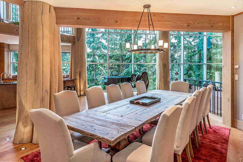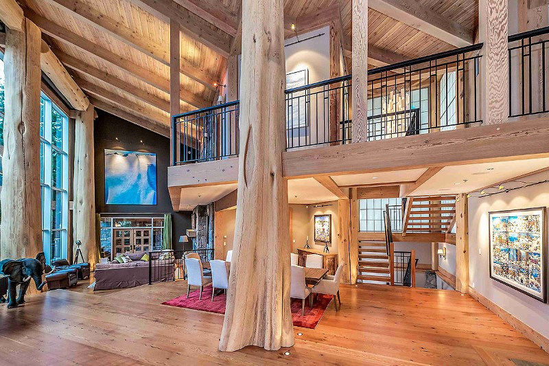 Hlavní podlaží představuje impozantní vstupní hala, která plynule přechází bez příček a dveří do společných respektive společenských „místností“ – kuchyně, jídelny a „obýváku“, rozmístěných v rámci jednoho otevřeného prostoru. Ten je objímán zdola i shora cedrovým dřevem v podobě vyhřívaných podlah, stropů a trámoví. Materiálově ho vyvažuje přírodní kámen (břidlice), z nějž jsou vystavěné krby, a je využit i na venkovní obklady. Desetimetrová prosklená stěna pak spojuje všechny tři výškové úrovně domu od podlahy ke střeše a poskytuje úchvatný panoramatický výhled. Ochozy patra jsou spojnicí čtyř prostorných pokojů, všechny s vlastní koupelnou. Z hlavní ložnice lze navíc sejít krytým venkovním schodištěm k horké vířivce, která je umístěna pod krytou terasou spojenou s obývacím prostorem přízemí.