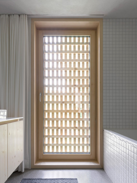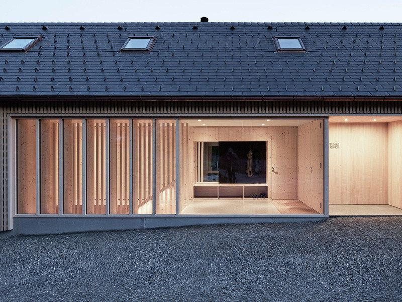Zajímavostí je také fasáda vytvořená jako síť z dřevěných lišt. Předsazená ostění oken dávají stavbě měřítko a strukturu. I díky sedlové střeše tak dům přirozeně zapadá do alpské krajiny Vorarlberska.