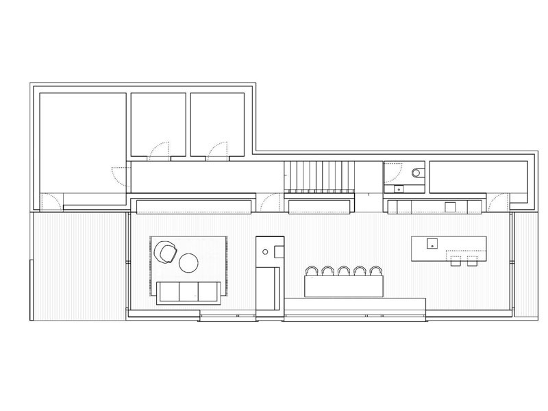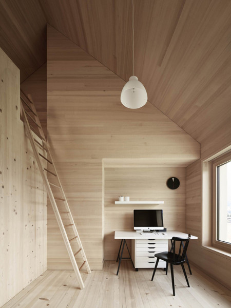 Obývací pokoj v přízemí odděluje od kuchyně a jídelny těleso krbu, podél všech prosklených ploch je sedací lavice umožňující kochat se výhledy do údolí. Ve vstupním patře jsou ložnice, doplněné ještě polopatrem sloužícím jako herna.