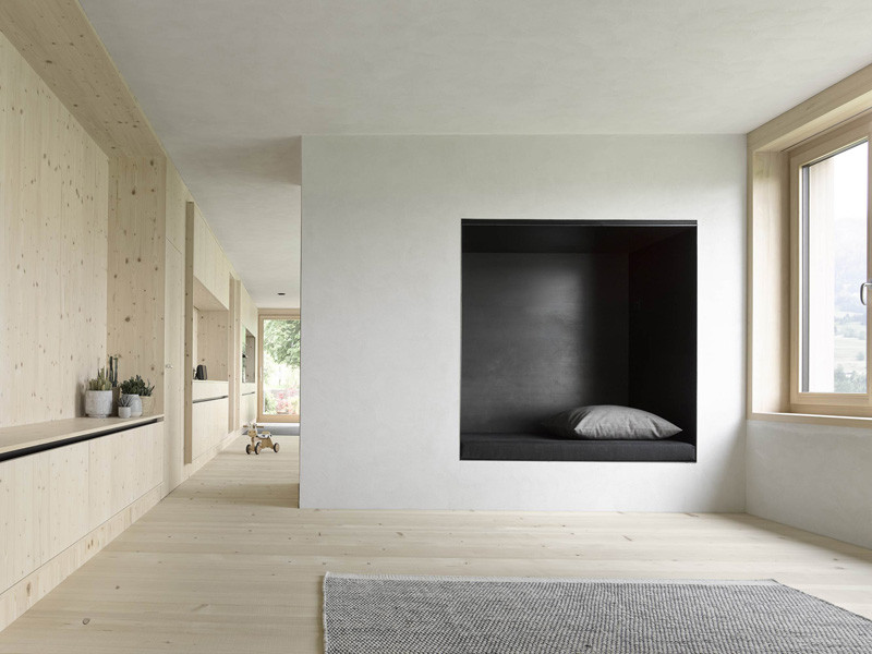Moderní dřevostavba od rakouského studia Innauer Matt Architekten je vklíněn mezi dva staré stromy, které určily její obdélníkový tvar. Postavena byla z masivních dřevěných panelů CLT, k nimž tvoří výrazný kontrast omítky ze světle šedé mramorové moučky. Prudký svah si vyžádal neobvyklé řešení: vstup do domu bude v patře, do přízemí se půjde po schodech. Navíc vyniká zajímavým ztvárněním fasády.